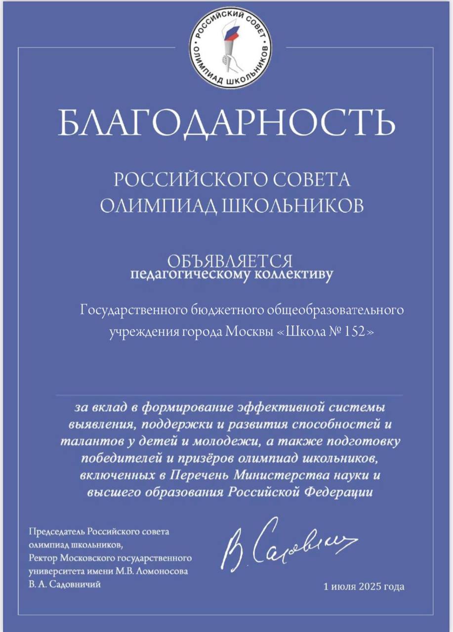 Сегодня мы с огромной гордостью и радостью принимаем Благодарность от Российского совета олимпиад школьников! Эта высокая оценка адресована нашему педагогическому коллективу за неоценимый вклад в создание и развитие эффективной системы выявления, поддержки и развития юных талантов, а также за блестящую подготовку победителей и призёров школьных олимпиад.